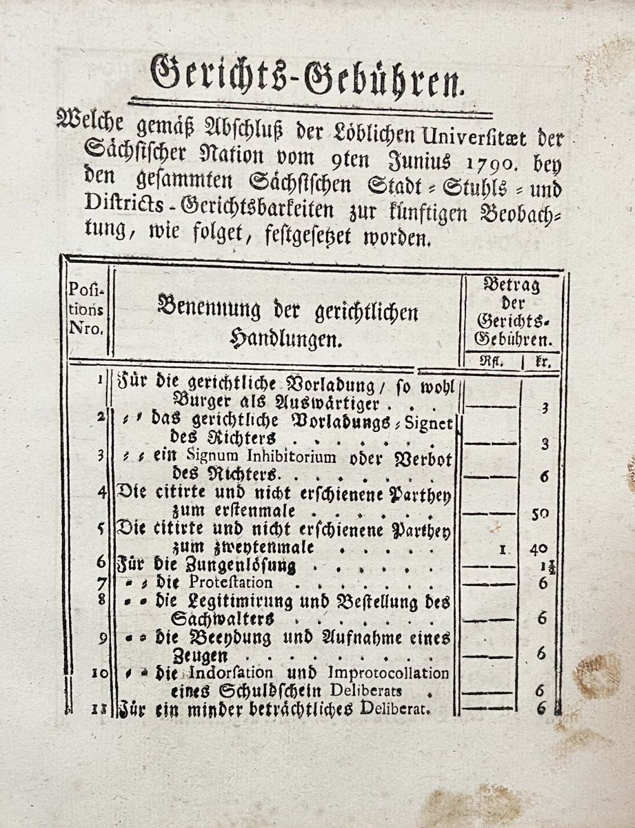 Description: Gerichts-Gebühren. Welche gemäß Abschluß der Löblichen Univerſitsæt der Sächsischer Nation vom 9ten Junius 1790. bey den gesammten Sächsischen Stadt = Stuhls = und Districts - Gerichtsbarkeiten zur kunftigen Beobach- tung, wie folget, festgesehet worden.