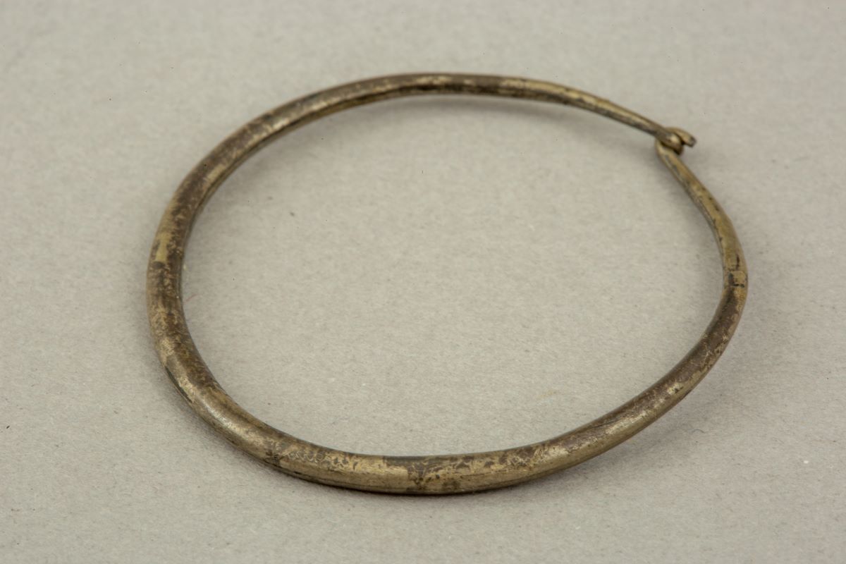 Description: Verigă din sârmă de argint, circulară în secțiune, care se subțiază spre terminații. Terminațiile sunt modelate în formă de cârlig și sunt petrecute unul peste celălalt.