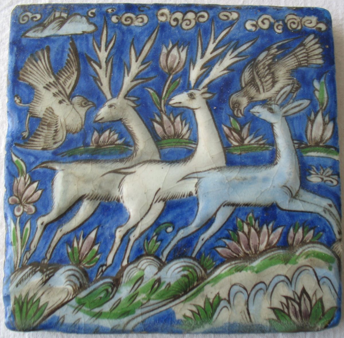 Description: Pe fond albastru cobalt, într-un peisaj cu stânci și flori, doi cerbi și o căprioară alergând spre dreapta, cu capetele întoarse spre spate. Deasupra, două păsări în zbor. Pe verso, cu negru, caracterele arabe pentru cifrele 012 (٠١٢); cu creion roșu, litera D.