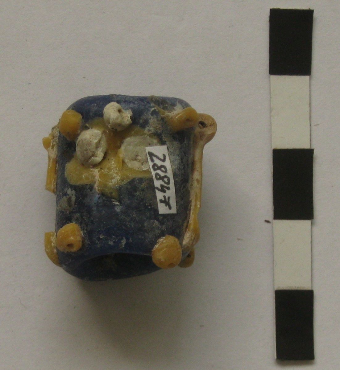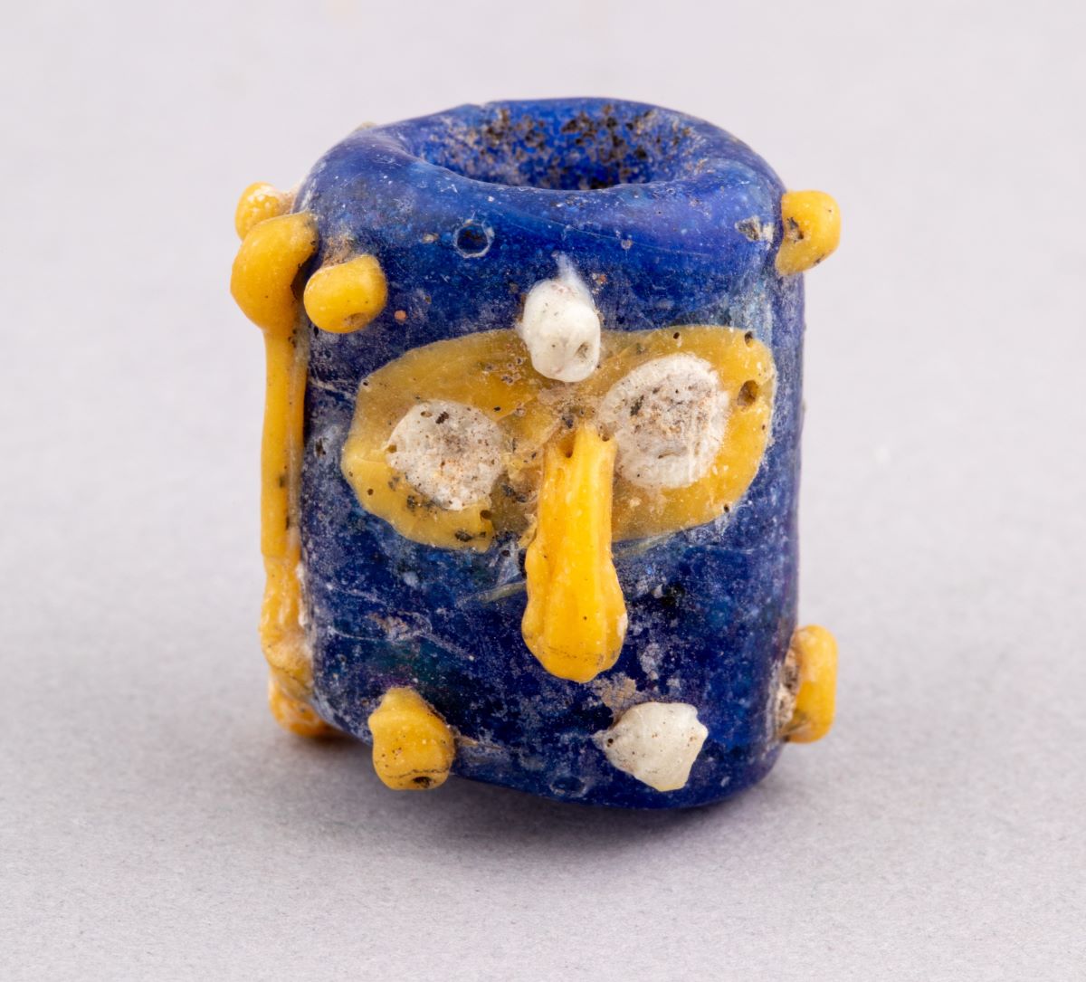 Description: Mărgea de formă cilindrică, cu capetele ușor evazate și rotunjite, realizată din sticlă de culoarea albastru închis, având aplicate o serie de pastile de sticlă galbenă și albă ce formează decorul, unele dintre ele fiind dispuse astfel încât să sugereze o față umană stilizată. Piesa face parte din inventarul unui mormânt de incinerație getic din necropola de la Zimnicea. Descoperită de: colectiv coordonat de prof. Univ. Dr. Mircea Babeș, format din arheologi de la Institutul de Arheologie „Vasile Pârvan” București (Anca Ganciu, Cristina Muja), Muzeul Județean Teleorman (Ecaterina Țânțăreanu, Ionuț Torcică, Tiberiu Nica) și Muzeul Județean Argeș (Dragoș Măndescu).