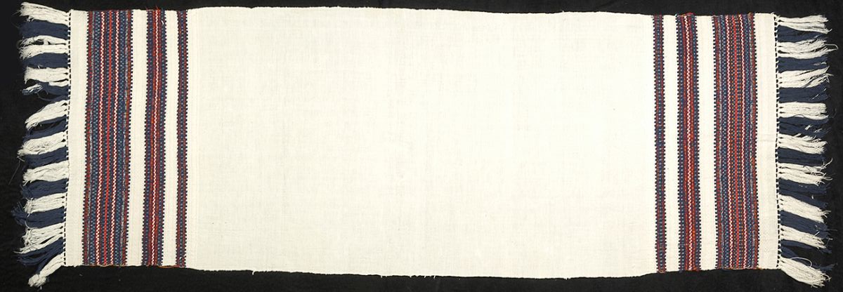 Description: Ștergar urzit și țesut în gospodăria țărănească la războiul de țesut, din urzeală de cânepă și băteală de cânepă și bumbac. Urzit și țesut în două ițe, de formă dreptunghiulară, format dintr-un lat de țesătură. Ornamentat la capete prin alesătură cu cordenciul pentru ridicarea firelor de urzeală, cu suveica printre firele de urzeală, cu mâna și ghemuțul peste și pe sub firele de urzeală dând aspectul de mici carouri diferite cromatic, conturând motivul numit dinții calului. Tivit simplu la capete. La capete sunt prevăzuți franjuri înnodați și prinși în tivitura ștergarului, de cromatică diferită în alb și albastru închis. Cromatica – alb, albastru, roșu, galben. Domeniul de folosință: decorarea interiorului de casă țărănească, folosit la ritualuri specifice sărbătorilor de peste an sau la evenimente importante din viața omului.