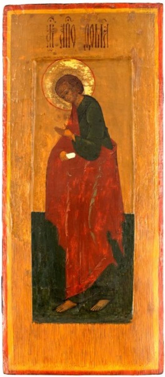 Description: Icoana a făcut parte din șirul Apostolilor unui iconostas. Apostolul Toma este redat în picioare, orientat spre stânga, pe fundalul ocru auriu al icoanei, în partea de sus, și verde în partea de jos. În jurul capului are un nimbus auriu. Poartă un chiton verde și un himation roșu. Cu mâna dreaptă ține un rotulus. Trăsăturile feței și modelul chipului, realizat în nuanțe succesive de ocru, sunt caracteristice stilului picturii rusești din secolele XVI-XVII. Icoana este în serie cu icoanele Sfântului Apostol Luca, Sfântului Apostol Bartolomeu, Sfântului Apostol Ioan Bogoslov, Sfântului Apostol Marcu și Sfântului Arhidiacon Aitala, fiind pictate de același zugrav și în aceeași perioadă. Blatul de lemn al icoanei este preparat la fel ca celelalte: pe față are o ramă lată decrosată și pe verso două traverse laterale.