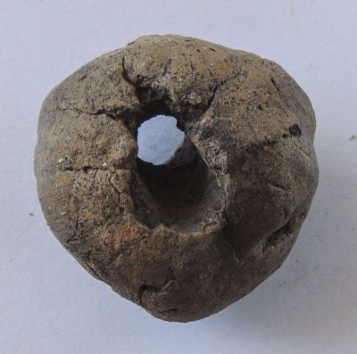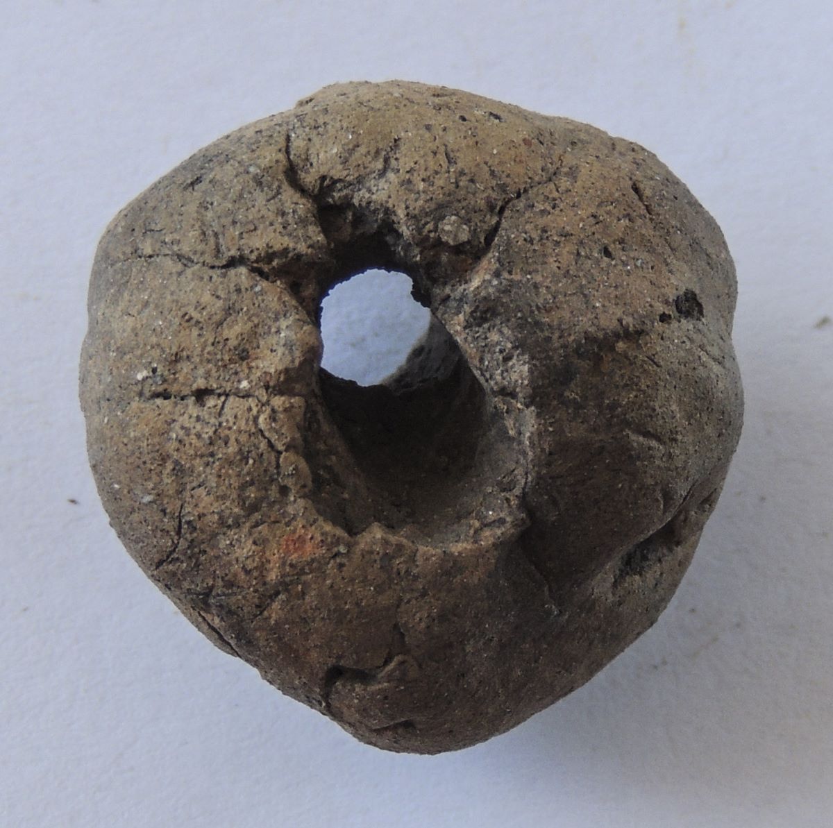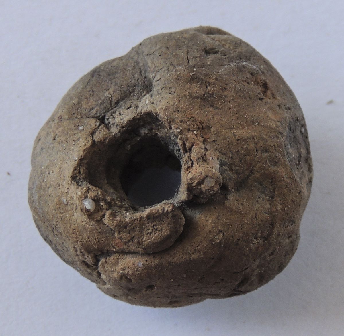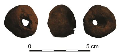 Description: Fusaiolă de formă circulară, sferică. A fost modelată din pastă degresată cu nisip cu bobul mic, având culoarea brună cu o pată cenușie. Are suprafețe zgrunțuroase. Nedecorată. La mijloc este perforată transversal, gaura având diametrul de 6 mm.