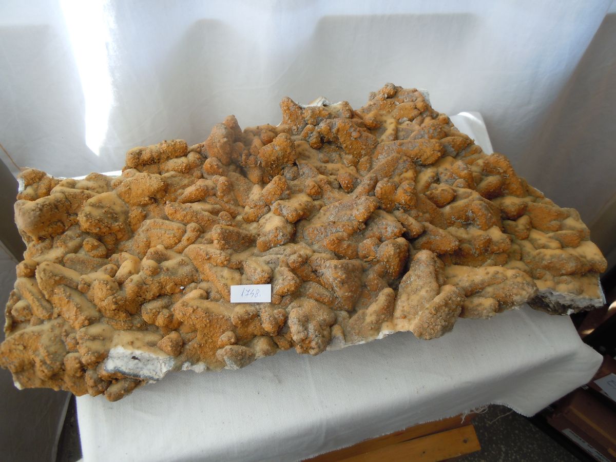 Description: Eșantion de dimensiuni mari. Este o apariție tipicǎ (o „carte de vizitǎ”) de la mina Cavnic, filonul Gheorghe, denumit „Gavrǎ”, care se remarcǎ în orice colecție. Cristale foarte fine submilimetrice, de cuarț, pe o crustǎ de calcit galben- maroniu, luciu mat. Aceasta perimorfozeazǎ o generație inițialǎ de calcit cristalizat în scalenoedrii înalți. Frumusețea este completatǎ de bogǎția de cristale milimetrice de piritǎ aurie, luciu puternic, presǎrate pe suprafațǎ, apariție mai rarǎ pe aceste eșantioane.