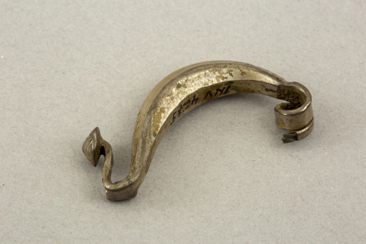 Description: Fibulă de tip tracic cu resort unilateral, format dintr-o spiră completă. Arcul îngroșat și decorat cu trei caneluri continuă cu piciorul în forma literei S, care se termină cu un buton piramidal, decorat cu linii incizate dispuse în forma unui romb dublu. Acul fibulei lipsește.