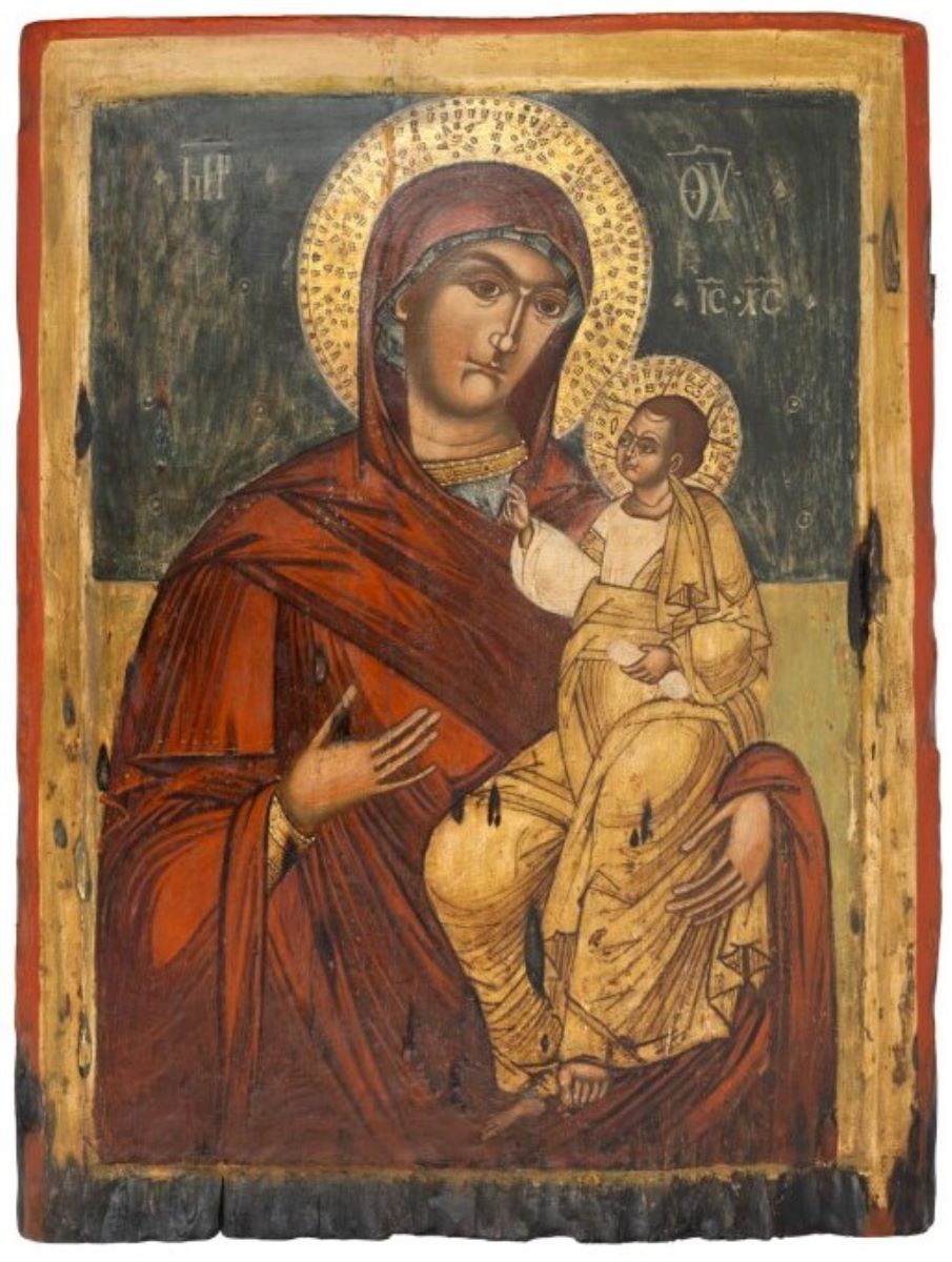 Description: Pe fondul verde-albăstrui în partea de sus și verde-oliv în partea de jos a icoanei, este reprezentată Maica Domnului, redată până mai jos de mijloc, ținând Pruncul pe brațul stâng și indicându-l cu dreapta (tipul Hodighitria). Figura statuară a Fecioarei ocupă întreg câmpul icoanei. Capul ușor aplecat spre Prunc și privirea gânditoare, precum și privirea lui Iisus îndreptată spre mamă, apropie această reprezentare de tipul Eleusa (Mângâietoarea). Maica Domnului poartă veșminte tradiționale: rochie și bonetă albastre, maforion roșu, drapat potrivit tipicului în cute unghiulare, realizate cu aceeași culoare în nuanțe mai închise. Pruncul Iisus este înveșmântat cu chiton alb și himation galben-auriu; binecuvântează cu dreapta, iar în stânga ține un rotulus. În jurul capetelor, nimburile de aur sunt decorate cu rotiță prin incizie.Trăsăturile chipurilor sunt realizate în stilul picturii brâncovenești: ovalul feței terminat cu bărbia rotunjită, ochii mari în formă de „solzi de pește”, subliniați de pleoape și cearcăne, sprâncene arcuite, nas drept, gură mică și roșie. Modelajul fețelor este realizat prin suprapuneri succesive de nuanțe de ocru, iar umbrele sunt redate cu brun-verzui și roșu. Panoul din lemn de tei, întărit la spate cu două traverse noi; pe față, lemn degroșat, rama înălțată este pictată cu galben-auriu și roșu; pictură tempera pe lemn.