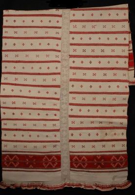 Description: Față de masă realizată în casa țărănească, țesută la războiul de țesut tradițional, din urzeală și băteală de bumbac. De formă dreptunghiulară formată din doi lați de țesătură cu îmbinare de dantelă. Ornamentată pe toată suprafața cu alesătură cu suveica printre fire, cu alesătură cu ghemuțul pentru ridicarea firelor, cu ghemuțul peste fire, cu speteaza pentru ridicarea firelor. La capete ornamentarea constă în frize cu motive precum coarnele berbecului, furca, vrâste alese în motivul spetei. Pe podul feței de masă sunt vrâste dispuse pe lățime în motivul numit pupi, alternând cu vrîste cu motive denumite în pene și cu vrâste cu motvul crucii. Dantela din mijlocul feței de masă este croșetată în casa țărănească cu acul de croșetat din fir de bumbac merverizat, prezentând motive precum roata - rombul și crucea în X. La capete este tivită simplu și are ca terminație fodră din pânză țesută la războiul de țesut ornamentală și cusută de tivitura feței de masă. Cromatica- alb, roșu, violet. Domeniul de folosință - decorarea interiorului țărăneasc.