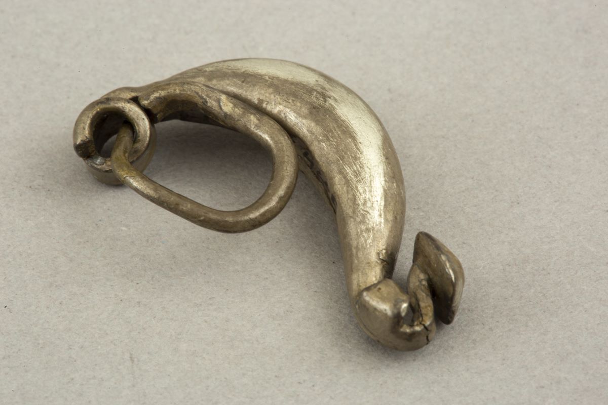 Description: Fibulă de tip tracic cu resort unilateral, format dintr-o spiră completă. Arcul îngroșat și nedecorat continuă cu piciorul în forma literei S, care se termină cu un buton piramidal, decorat cu linii incizate dispuse în forma unui romb dublu. Acul fibulei este rupt, iar prin resort a fost petrecută o verigă din sârmă de argint circulară în secțiune, având formă relativ rectangulară.
