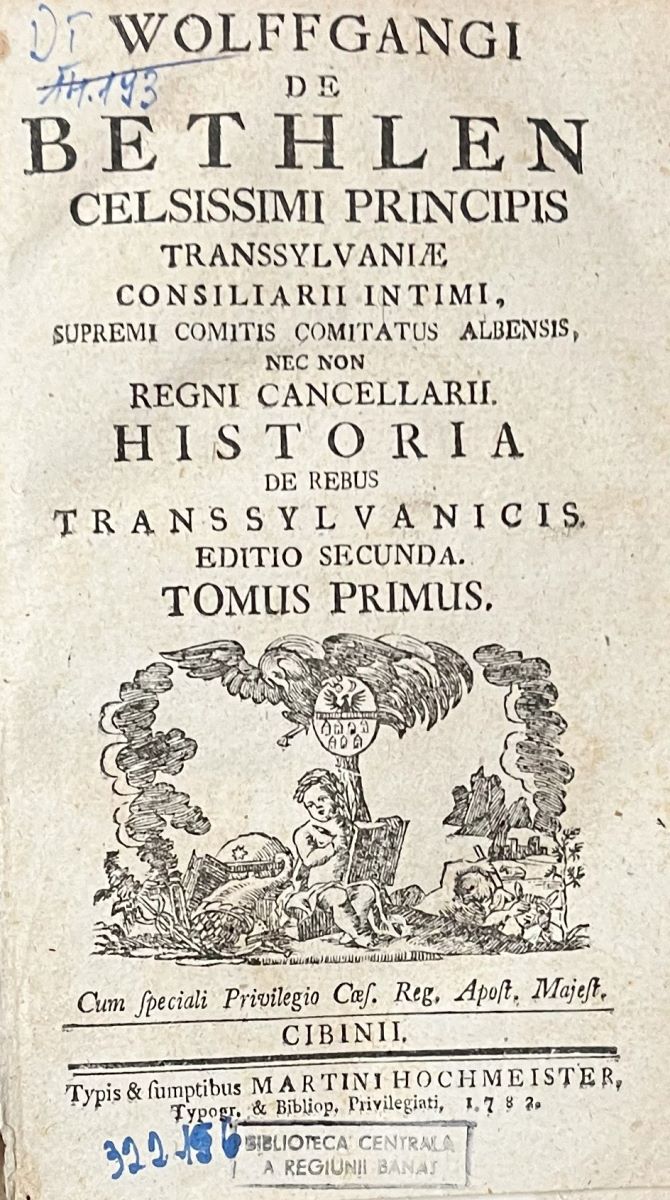 Description: Wolfgangi de Bethlen celsissimi principis Transsylvaniae consiliarii intimi, supremi comitis comitatus Albensis, nec non regni cancellarii. Historia de rebus Transsylvanicis. Editio secunda. Tomus primus. Cum speciali privilegio Caes. Reg. Apost. Majest. Cibinii. Typis et sumptibus Martini Hochmeister. Typogr. & Bibliop. Privilegiati, 1782