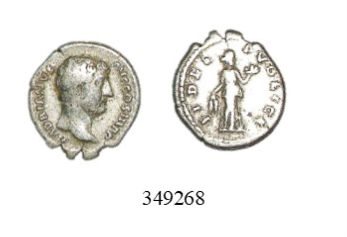 Fides în picioare, spre dreapta, ținând spice de grâu și un coș cu fructe.