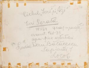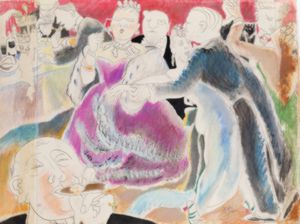 Description: Compoziție cu personaje înfățișând un moment dintr-un dans de societate. În prim plan, un personaj feminin cu o rochie cu umerii goi, în nuanțe de violet, cu o panglică verde cu galben, bijuterii opulente la gât, ochelarii pe care îi ține cu mâna dreaptă și o eșarfă pe umeri este invitat la dans de un personaj masculin în costum negru; acesta are o postură ușor aplecată, mâna întinsă spre personajul feminin redat într-o atitudine galantă. În fundal, mai multe personaje, feminine și masculine, în costume de gală. Lucrarea face parte dintr-un ciclu care prezenta aspecte imaginate (și idealizate) ale societății secolului al XIX-lea („Ieri”), în contrast cu societatea contemporană artistei („Azi”).