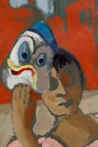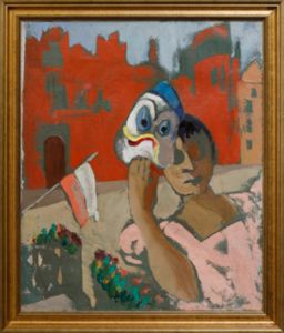 Description: Peisaj urban (orașul Gdansk - Polonia, conform titlului oferit de artistă): are în prim-plan o siluetă feminină reprezentată bust, ține o mască înfățișând chipul unui rățoi cu beretă de marinar (probabil personajul Donald Duck), care îi acoperă parțial figura; în fundal, se profilează clădiri înalte și un steag al Poloniei în partea stângă. Din gama cromatică se remarcă utilizarea roșului pentru arhitectura din fundal, care oferă greutate compoziției.