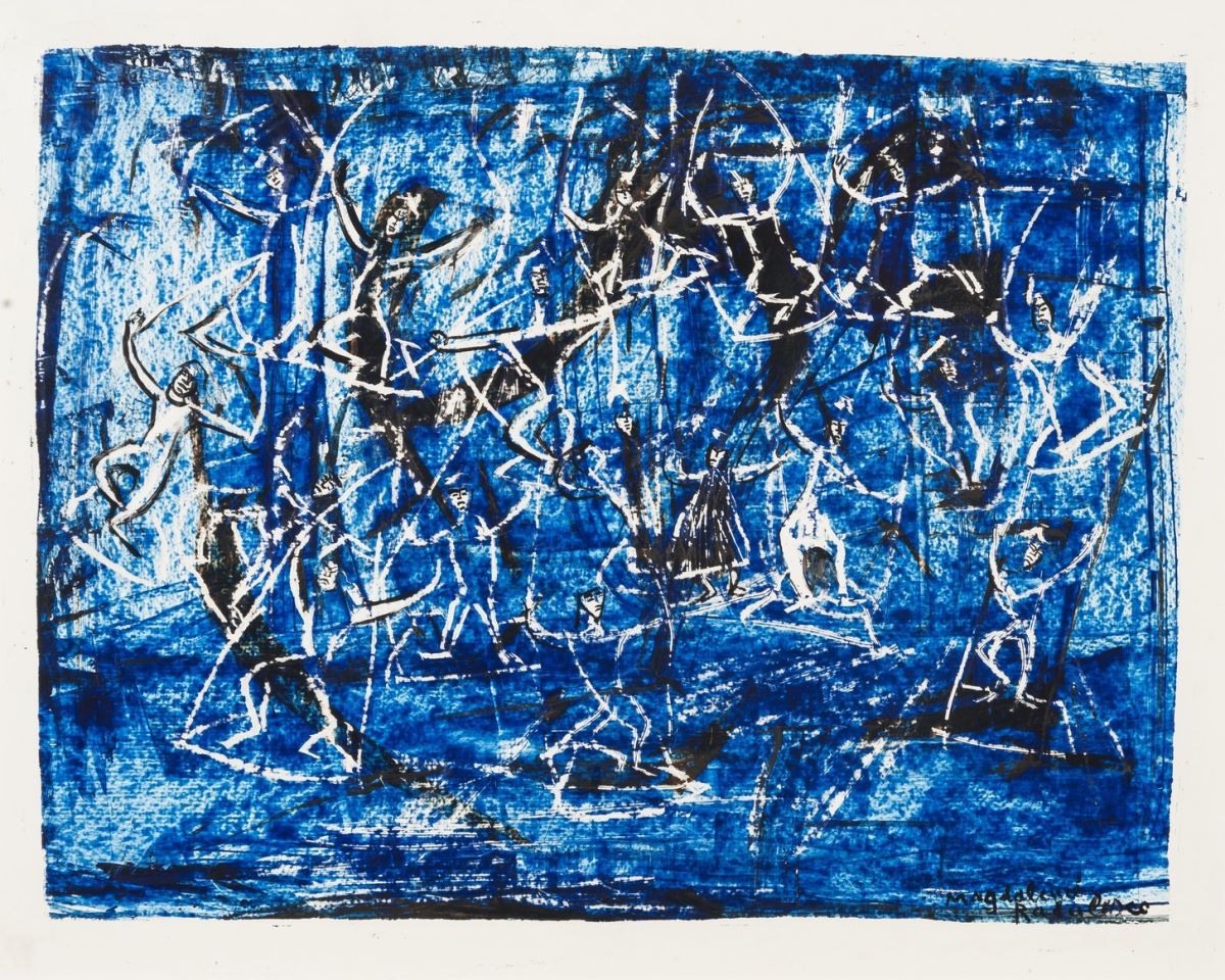 Description: Compoziție simili-abstractă cu grup de personaje stilizate, miniaturizate, prinse într-un dans ritual. Tipurile umanoide se mișcă într-un ritm frenetic pe un fundal neutru, figuri albe pe fond albastru. Simplificările personajelor evocă unele picturi rupestre. Gamă cromatică prevalent rece.